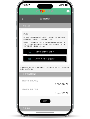 携帯電話番号・メールアドレスで受け取る場合は、事前に口座番号と携帯電話番号やメールアドレスを紐づける「受取設定」が必要です。