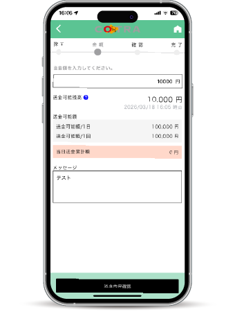 1回または1日あたり10万円以下の送金が手数料無料で利用できます。24時間365日、いつでも送金可能です。