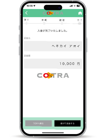 へきしんアプリにログインのうえ、ネットバンキングからことら送金を起動し送金方法を選択することで簡単に送金できます。携帯電話番号・メールアドレスあてに送金する場合は、送金相手が事前に口座と携帯電話番号やメールアドレスを紐づけておく必要があります。
